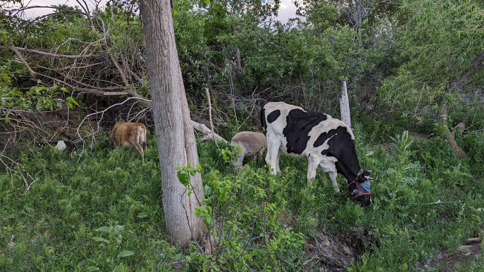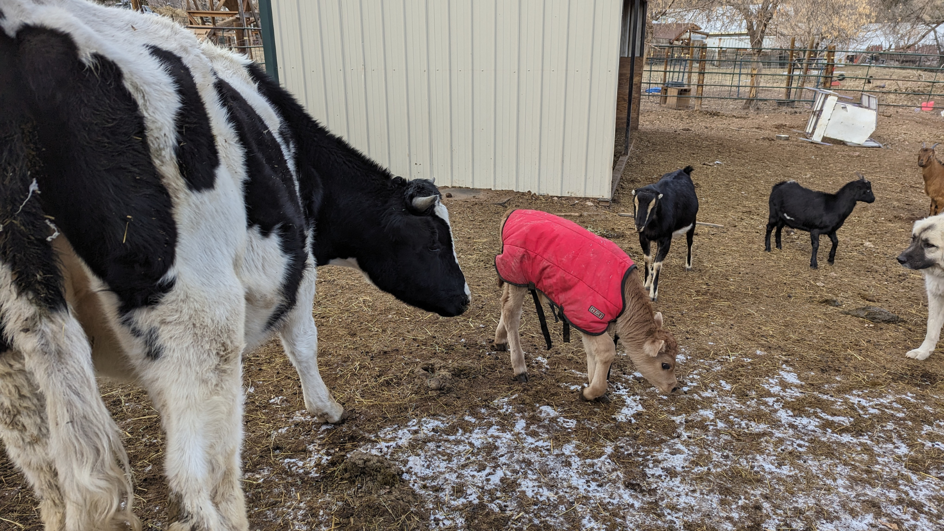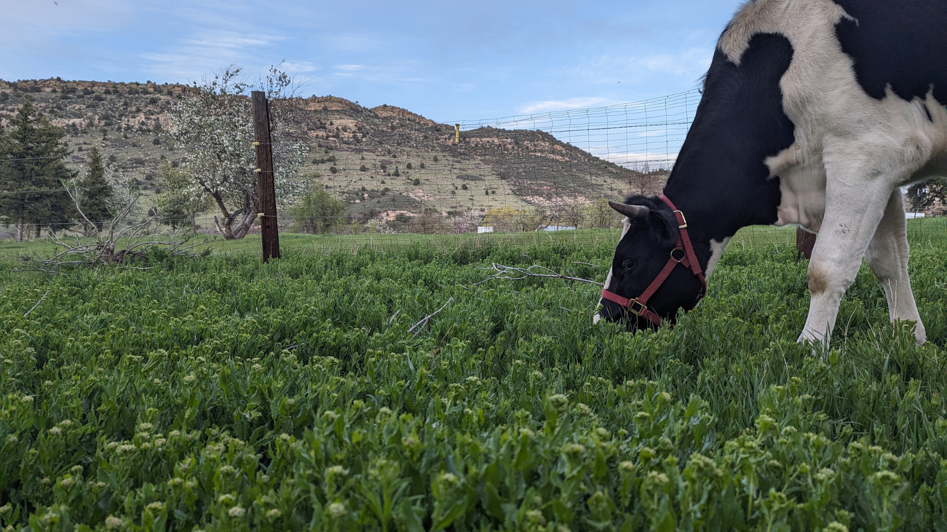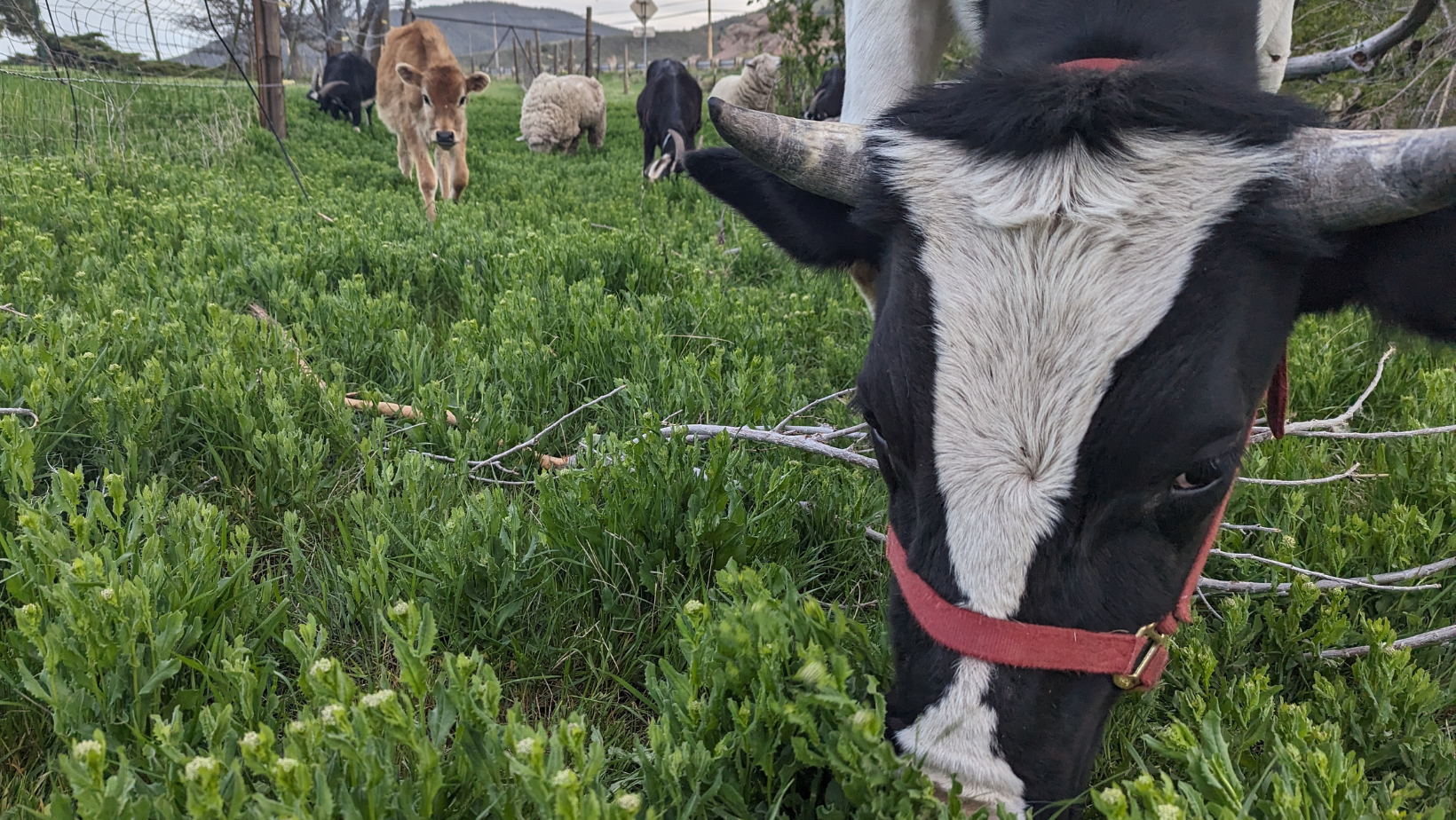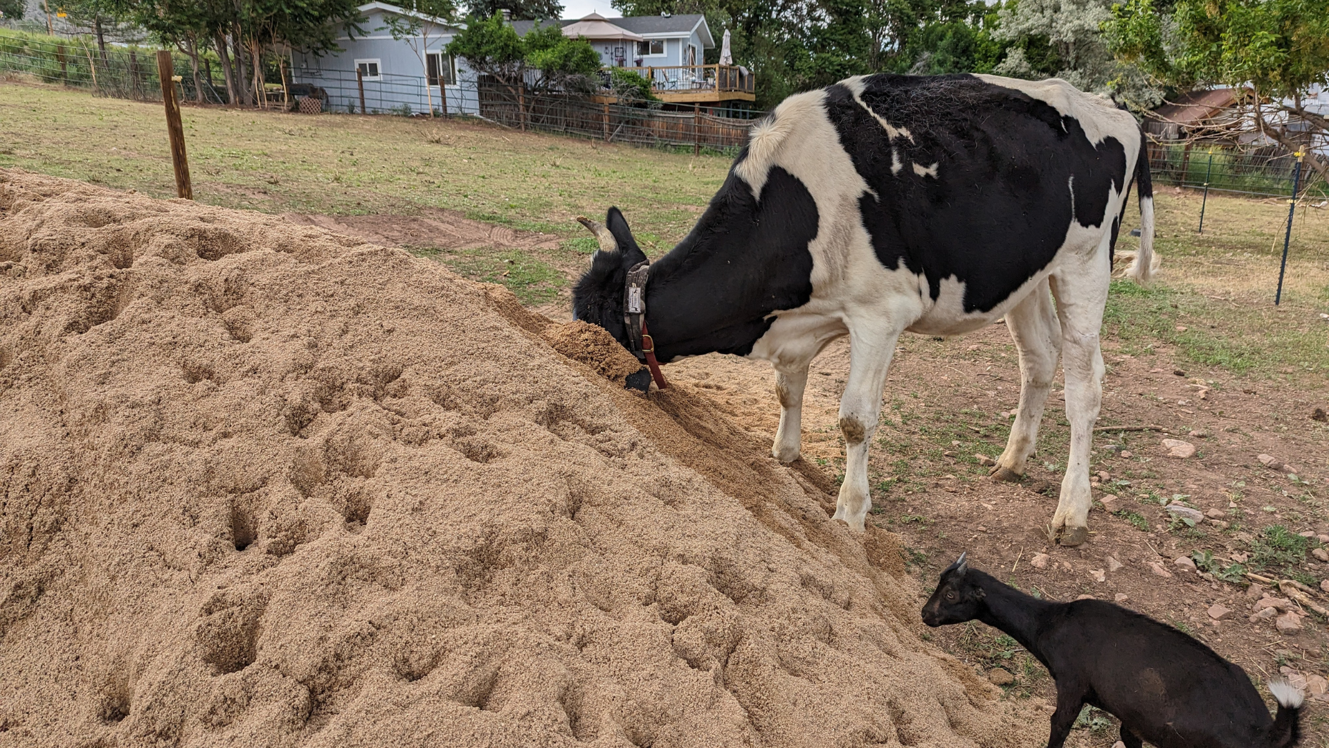 Jeff joined our menagerie as a bottle calf in June 2022. We were seeking a larger weed-eater to add to our little herd and were aware of the unfortunate plight of dairy steers. Jeffrey is endlessly affectionate, though he's unaware of his size and can be quite rambunctious. He loves scratches and biscuits.Fun Fact: Jeffrey is a Holstein, the largest breed of dairy cattle. Holsteins are the most common cows on commercial dairy farms, making up 80% of all dairy cows in the U.S.