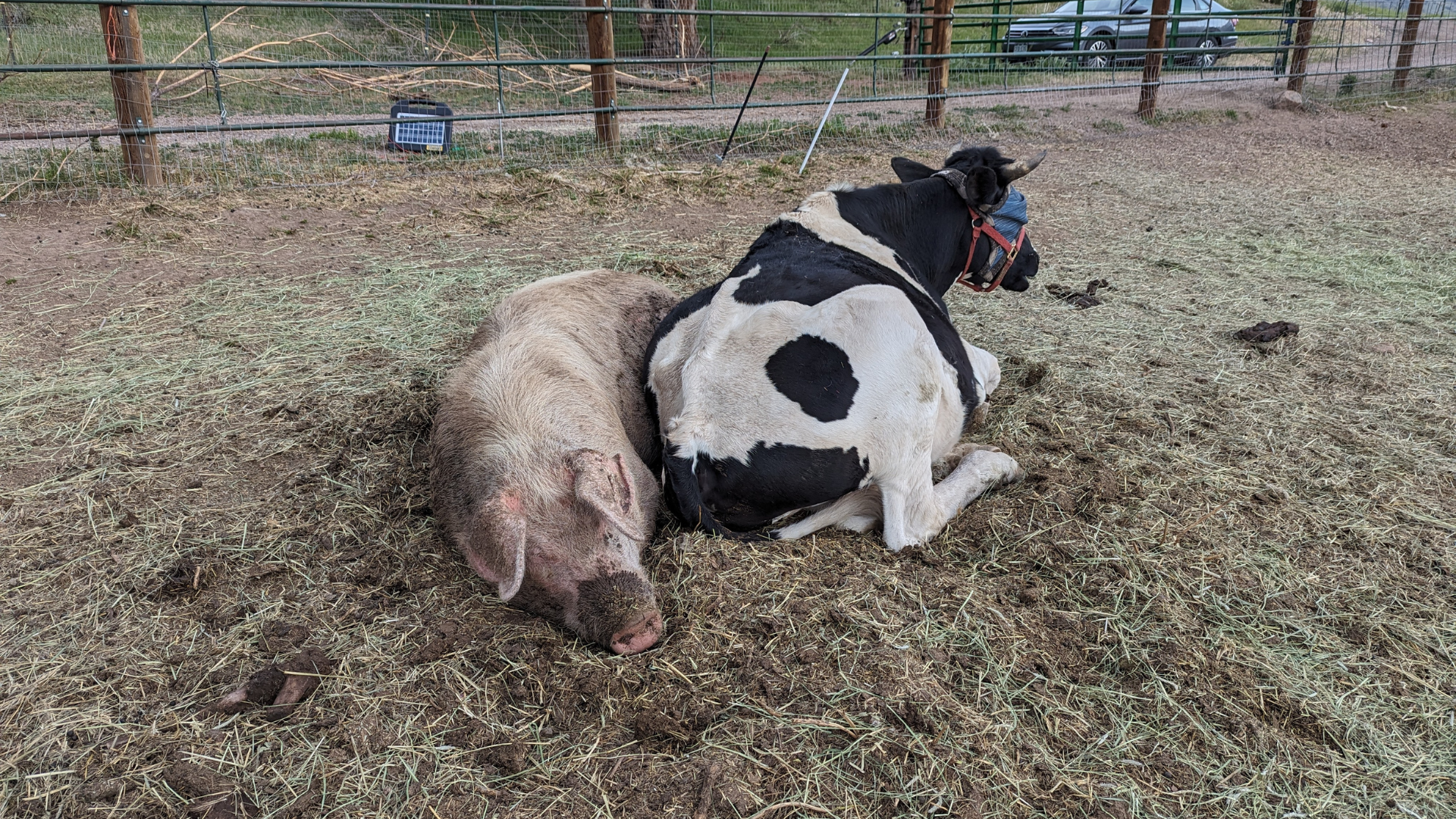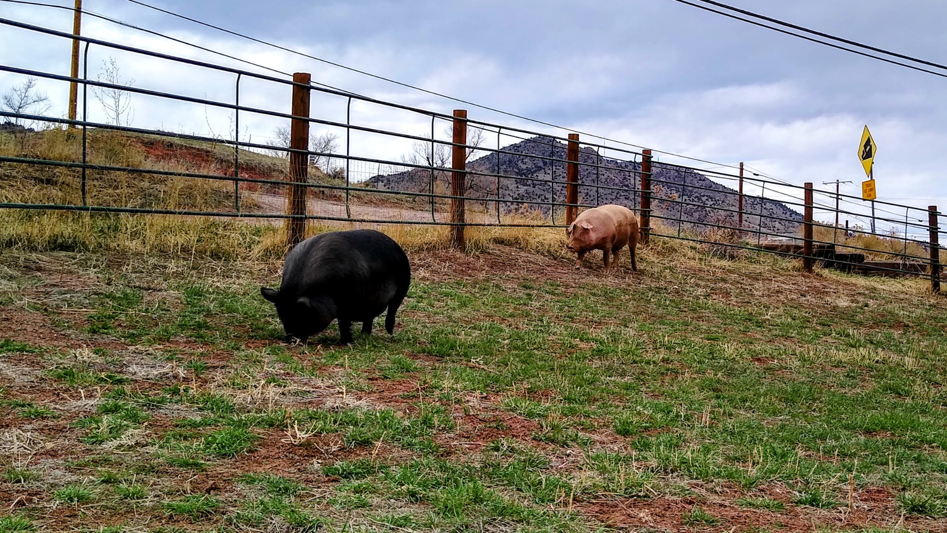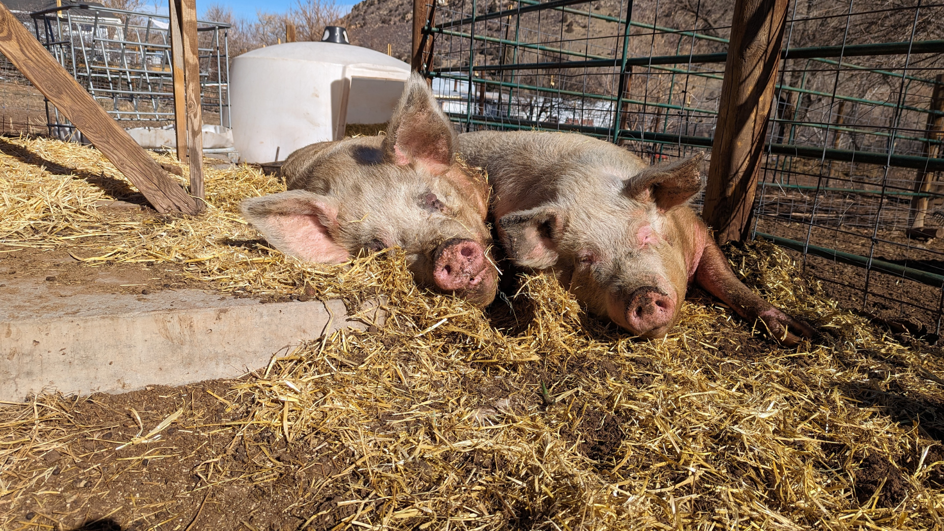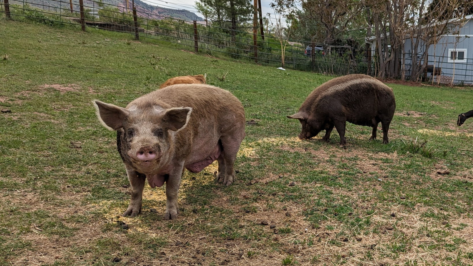 Penny came to us after Dudley moved outside and made it clear he wanted a porcine companion. It was the Spring of 2020 and COVID was in full swing, meat processors were shutting down and farmers were trying to get rid of piglets by the truckload with nowhere else to take them. Molly drove hours into rural Colorado and picked that saddest, sickliest piglet she saw. We weren't sure if Penny was going to make it at first, but now she's a robust member of the family. Penny was kept with hundreds of other piglets, and her tail was docked short right after she was born. Her and Dudley quickly became good friends, and even though she's much bigger than him now, she still thinks of him as her big brother and lets him boss her around. Penny has structural concerns from poor genetics and is prone to arthritis. It's important that we manage her weight closely and keep her lean so that she is able to maintain her mobility.